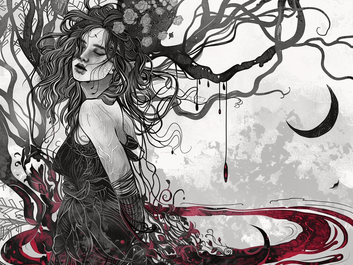 She of the Sanguine Rose is guardian spirit of the portals between the living and other. She is a wanderer of the Netherworld, and a Patron of the Forest of Shadows.