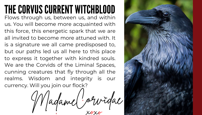 In many belief systems, birds of the Corvus or Corvid family are highly regarded as legendary and powerful creatures. They are mischievous, sociable, and expressive creatures. Spending time in [brilliantly named] flocks to protect one another or to band together to mob raptors. Wherever there is civilization and Corvids sharing the same space, there are folkloric tales being weaved about them. From guardians and bringers of boon to harbingers of death with tongues of devil’s blood, Corvids are often magnanimous creatures whose messages are not to be ignored. Our Inner Coven follows the stories of Corvids, learning lessons from both their myths and their Earthly behavior. It is a common occurrence for Corvus Current Vampyres to end up with a Corvid familiar spirit during their time and journey with us.